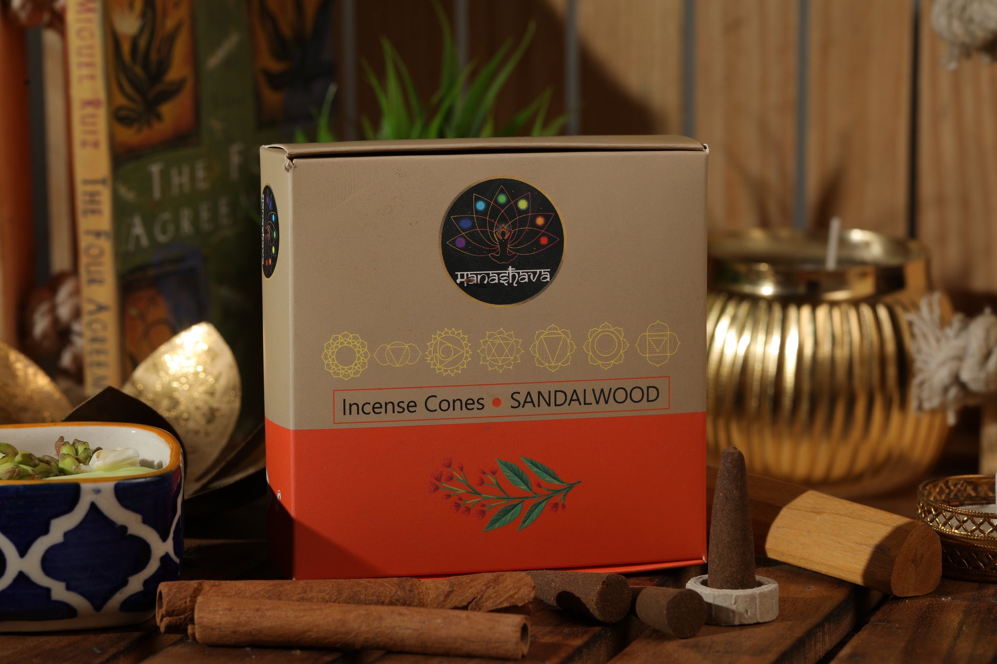 Sandalwood Incense Cones: Indulge in the grounding and earthy aroma of Manastavaa's Sandalwood Incense Cones. Crafted with care from recycled flowers and organic ingredients, these cones offer a sustainable and eco-conscious way to experience the timeless scent of sandalwood. The charcoal-free formula ensures a pure and authentic fragrance, creating a warm and comforting ambiance in your space. Whether for meditation, relaxation, or simply enhancing your surroundings, let the harmonious blend of Sandalwood notes elevate your sensory journey.