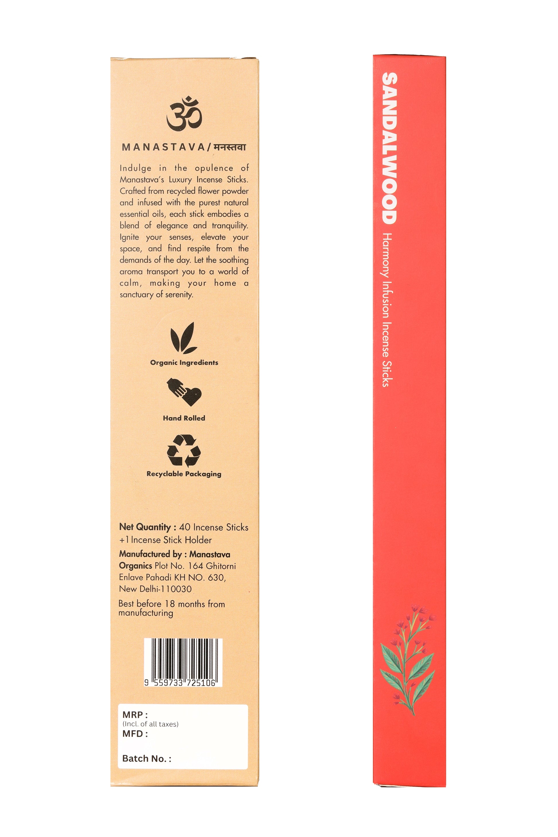 Sandalwood: Experience the grounding and earthy essence of Sandalwood with Manastavaa's charcoal-free incense sticks. Our Sandalwood fragrance is a harmonious blend of warmth and tranquility, creating a calming ambiance that lingers in the air. Crafted from recycled flowers and organic ingredients, these incense sticks offer a sustainable and eco-conscious way to elevate your space. Imbibe your surroundings with the timeless and comforting aroma of Sandalwood, enhancing your moments of reflection and relaxation.